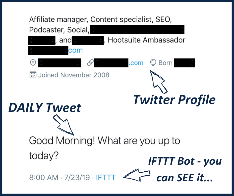 Let’s take another look at a bot strategy in action. Remember the twitter example I used earlier about scheduling tweets that were at least composed as tweets? Even this can be horribly executed with a bot. This involves an app that can actually be useful for some things but that many use as a sophisticated bot called IFTTT (If This, Then That). This guy whose name I’ve blocked out so as not to take direct public shots at him fashions himself a “content specialist”. Good grief - let’s take a look at how “special” his content is: